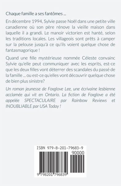 Chaque famille a ses fantômes ... En décembre 1994, Sylvie passe Noël dans une petite ville canadienne où son père rénove la vieille maison dans laquelle il a grandi. Le manoir victorien est hanté, selon les traditions locales. Les villageois sont prêts à camper sur la pelouse jusqu'à ce qu'ils voient quelque chose de fantasmagorique ! Quand une fille mystérieuse nommée Céleste convainc Sylvie qu'elle peut communiquer avec les esprits, est-ce que les deux filles vont déterrer des scandales du passé de la famille ... ou est-ce qu'elles vont découvrir quelque chose de bien plus sinistre? Un roman jeunesse de Foxglove Lee, une écrivaine lesbienne acclamée qui vit en Ontario. La fiction de Foxglove a été appelée SPECTACULAIRE par Rainbow Reviews et INOUBLIABLE par USA Today !