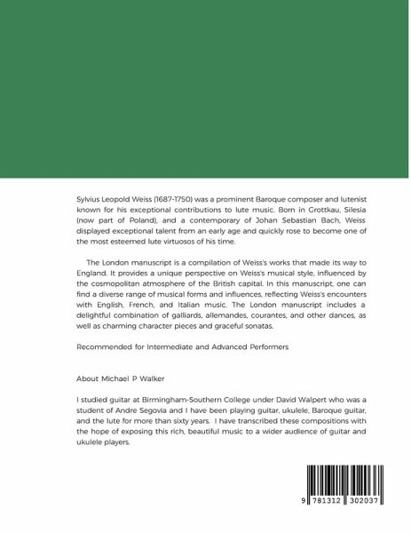 Sylvius Leopold Weiss (1687-1750) was a prominent Baroque composer and lutenist known for his exceptional contributions to lute music. Born in Grottkau, Silesia (now part of Poland), and a contemporary of Johan Sebastian Bach, Weiss displayed exceptional talent from an early age and quickly rose to become one of the most esteemed lute virtuosos of his time. The London manuscript is a compilation of Weiss's works that made its way to England. It provides a unique perspective on Weiss's musical style, influenced by the cosmopolitan atmosphere of the British capital. In this manuscript, one can find a diverse range of musical forms and influences, reflecting Weiss's encounters with English, French, and Italian music. The London manuscript includes a delightful combination of galliards, allemandes, courantes, and other dances, as well as charming character pieces and graceful sonatas.