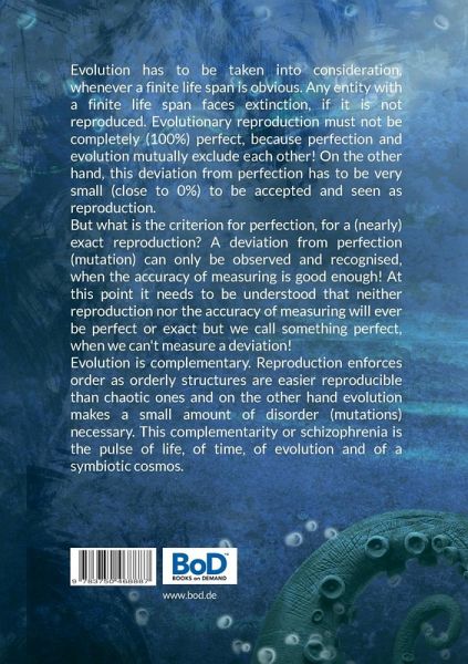 Evolution has to be taken into consideration, whenever a finite life span is obvious. Any entity with a finite life span faces extinction, if it is not reproduced. Evolutionary reproduction must not be completely (100%) perfect, because perfection and evolution mutually exclude each other! On the other hand, this deviation from perfection has to be very small (close to 0%) to be accepted and seen as reproduction.But what is the criterion for perfection, for a (nearly) exact reproduction? A deviation from perfection (mutation) can only be observed and recognised, when the accuracy of measuring is good enough! At this point it needs to be understood that neither reproduction nor the accuracy of measuring will ever be perfect or exact but we call something perfect, when we can't measure a deviation!Evolution is complementary. Reproduction enforces order as orderly structures are easier reproducible than chaotic ones and on the other hand evolution makes a small amount of disorder (mutations) necessary. This complementarity or schizophrenia is the pulse of life, of time, of evolution and of a symbiotic cosmos.