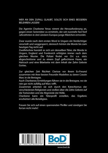 WER AN DEN ZUFALL GLAUBT, SOLLTE SICH EINES BESSEREN BELEHREN LASSEN!Die Agentin Charleene Yenac nimmt die Herausforderung an, gegen einen Serientäter zu ermitteln, der seit nunmehr fast fünf Jahrzehnten in drei Ländern Europas junge Mädchen ermordet.Zwar wurde nach dem ersten Mord in Ungarn ein Verdächtiger verurteilt und weggesperrt, dennoch hörten die Morde bis zum heutigen Tag nicht auf.Zweifelsohne handelt es sich um denselben Täter, die Morde in Ungarn, England und Frankreich erfolgten immer nach dem gleichen Muster. Die Polizei findet vor Ort u.a. stets abgeschnittene und zu einem Zopf geflochtene Haare, ein Halstuch und eine Bibelseite mit dem Inhalt der Zehn Gebote Gottes.Zur gleichen Zeit flüchtet Clarisse vor ihrem Ex-Freund zusammen mit ihrer besten Freundin Madeline zu deren Cousin Marc in die Bretagne. Auch Charleenes Ermittlungen führen sie in die Bretagne, wo sie rein gar nicht zufällig auf Marc trifft.Zusammen arbeiten sie sich durch den Katechismus der verschiedenen Religionen und stoßen über die Zehn Gebote auf die Todsünden und die Abgründe der Hölle.Charleene kann ein Täterprofil erstellen, das Ergebnis erschüttert alle Beteiligten.Freuen Sie sich auf einen spannenden Thriller und sündigen Sie fortan nicht mehr!