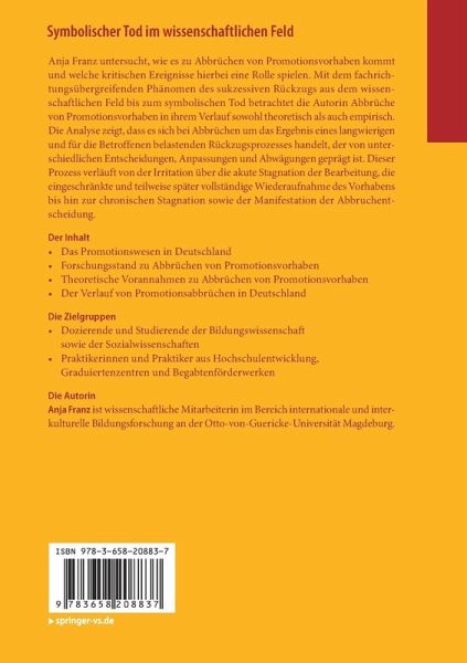 Anja Franz untersucht, wie es zu Abbrüchen von Promotionsvorhaben kommt und welche kritischen Ereignisse hierbei eine Rolle spielen. Mit dem fachrichtungsübergreifenden Phänomen des sukzessiven Rückzugs aus dem wissenschaftlichen Feld bis zum symbolischen Tod betrachtet die Autorin Abbrüche von Promotionsvorhaben in ihrem Verlauf sowohl theoretisch als auch empirisch. Die Analyse zeigt, dass es sich bei Abbrüchen um das Ergebnis eines langwierigen und für die Betroffenen belastenden Rückzugsprozesses handelt, der von unterschiedlichen Entscheidungen, Anpassungen und Abwägungen geprägt ist. Dieser Prozess verläuft von der Irritation über die akute Stagnation der Bearbeitung, die eingeschränkte und teilweise später vollständige Wiederaufnahme des Vorhabens bis hin zur chronischen Stagnation sowie der Manifestation der Abbruchentscheidung.