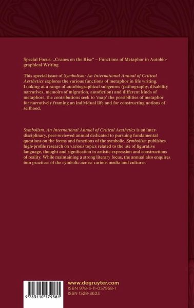This special issue of Symbolism: An International Annual of Critical Aesthetics explores the various functions of metaphor in life writing. Looking at a range of autobiographical subgenres (pathography, disability narratives, memoirs of migration, autofiction) and different kinds of metaphors, the contributions seek to 'map' the possibilities of metaphor for narratively framing an individual life and for constructing notions of selfhood.