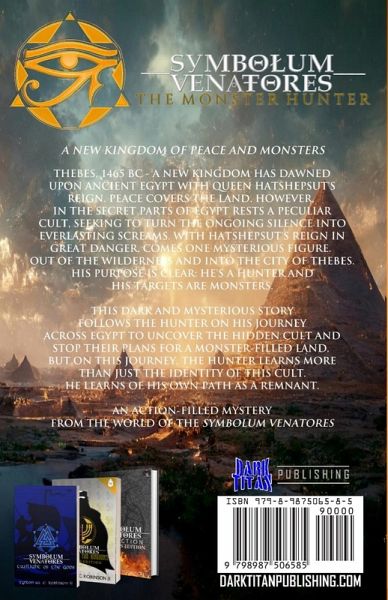 A NEW KINGDOM OF PEACE AND MONSTERS Thebes, 1465 BC - A New Kingdom has dawned upon Ancient Egypt with Queen Hatshepsut's reign. Peace covers the land. However, in the secret parts of Egypt rests a peculiar cult, seeking to turn the ongoing silence into everlasting screams. With Hatshepsut's reign in great danger, comes one mysterious figure. Out of the wilderness and into the city of Thebes. His purpose is clear: He's a Hunter and his targets are Monsters. This dark and mysterious story follows The Hunter on his journey across Egypt to uncover the hidden cult and stop their plans for a monster-filled land. But on this journey, The Hunter learns more than just the identity of this cult. He learns of his own path as a Remnant. An action-filled mystery from the World of the Symbolum Venatores.