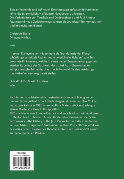 Dieses Werk wurde innerhalb von 45 Jahren entwickelt. Es revolutioniert das Konzept der Klangschöpfung durch modale Bewegung. Mit dieser Theorie ist eine völlig neue Betrachtung von Harmonien möglich. Die symmetrische Wurzel kommt in vielen Modi vor, mithilfe derer Tritoni oder übermäßige Dreiklänge gestaltet werden können. Diese Vorgehensweise bringt einen logischen Ablauf und eine neue Form von Harmonien in die Musik. Auch die Erweiterung von Modi durch die Überlagerung von musikalischen Einheiten spielt dabei eine Rolle. This book has been written over a 45 year period. It revolutinizes the concept of pitch relation through modal movement. A reestablishment of harmony is possible with the realization of this theory. A symmetrical root appears in many modes which can be utilized to pattern tritones or augmented triads. This brings a logic into music and a new form for harmony. Also, the expansion upon modes with the superimposition of musical unities is discussed.