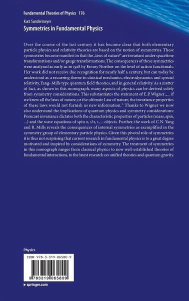 Over the course of the last century it has become clear that both elementary particle physics and relativity theories are based on the notion of symmetries. These symmetries become manifest in that the "laws of nature" are invariant under spacetime transformations and/or gauge transformations. The consequences of these symmetries were analyzed as early as in 1918 by Emmy Noether on the level of action functionals. Her work did not receive due recognition for nearly half a century, but can today be understood as a recurring theme in classical mechanics, electrodynamics and special relativity, Yang-Mills type quantum field theories, and in general relativity. As a matter of fact, as shown in this monograph, many aspects of physics can be derived solely from symmetry considerations. This substantiates the statement of E.P. Wigner "... if we knew all the laws of nature, or the ultimate Law of nature, the invariance properties of these laws would not furnish us new information." Thanks to Wigner we now also understand the implications of quantum physics and symmetry considerations: Poincare invariance dictates both the characteristic properties of particles (mass, spin, ...) and the wave equations of spin 0, 1/2, 1, ... objects. Further, the work of C.N. Yang and R. Mills reveals the consequences of internal symmetries as exemplified in the symmetry group of elementary particle physics. Given this pivotal role of symmetries it is thus not surprising that current research in fundamental physics is to a great degree motivated and inspired by considerations of symmetry. The treatment of symmetries in this monograph ranges from classical physics to now well-established theories of fundamental interactions, to the latest research on unified theories and quantum gravity.