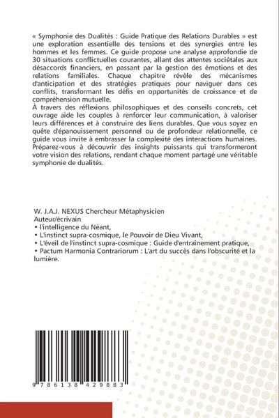 « Symphonie des Dualités : Guide Pratique des Relations Durables » est une exploration essentielle des tensions et des synergies entre les hommes et les femmes. Ce guide propose une analyse approfondie de 30 situations conflictuelles courantes, allant des attentes sociétales aux désaccords financiers, en passant par la gestion des émotions et des relations familiales. Chaque chapitre révèle des mécanismes d'anticipation et des stratégies pratiques pour naviguer dans ces conflits, transformant les défis en opportunités de croissance et de compréhension mutuelle.À travers des réflexions philosophiques et des conseils concrets, cet ouvrage aide les couples à renforcer leur communication, à valoriser leurs différences et à construire des liens durables. Que vous soyez en quête d'épanouissement personnel ou de profondeur relationnelle, ce guide vous invite à embrasser la complexité des interactions humaines. Préparez-vous à découvrir des insights puissants qui transformeront votre vision des relations, rendant chaque moment partagé une véritable symphonie de dualités.
