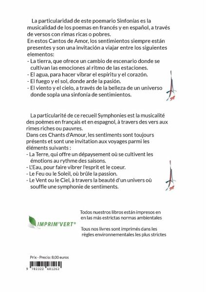 La particularité de ce recueil Symphonies est la musicalité des poèmes en français et en espagnol, à travers des vers aux rimes riches ou pauvres. Dans ces Chants d'Amour, les sentiments sont toujours présents et sont une invitation aux voyages parmi les éléments suivants :- La Terre, qui offre un dépaysement où se cultivent les émotions au rythme des saisons.- L'Eau, pour faire vibrer l'esprit et le coeur.- Le Feu ou le Soleil, où brûle la passion.- Le Vent ou le Ciel, à travers la beauté d'un univers où souffle une symphonie de sentiments.La particularidad de este poemario Sinfonías es la musicalidad de los poemas en francés y en español, a través de versos con rimas ricas o pobres. En estos Cantos de Amor, los sentimientos siempre están presentes y son una invitación a viajar entre los siguientes elementos:- La Tierra, que ofrece un cambio de escenario donde las emociones al ritmo de las estaciones.- El Agua, para hacer vibrar el espíritu y el corazón.- El Fuego o el Sol, donde arde la pasión.- El Viento o el Cielo, a través de la belleza de un universo donde sopla una sinfonía de sentimientos.