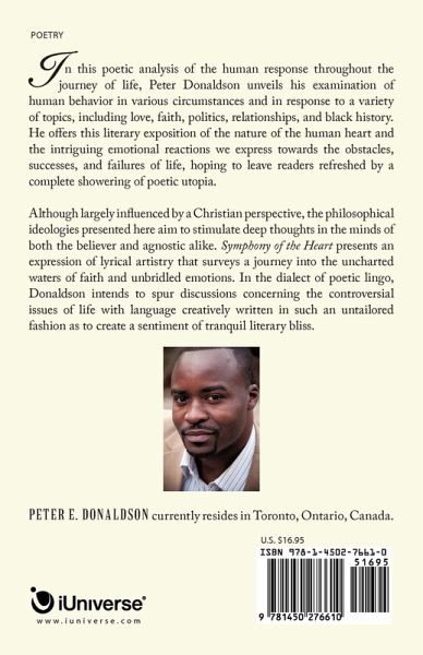 In this poetic analysis of the human response throughout the journey of life, Peter Donaldson unveils his examination of human behavior in various circumstances and in response to a variety of topics, including love, faith, politics, relationships, and black history. He offers this literary exposition of the nature of the human heart and the intriguing emotional reactions we express towards the obstacles, successes, and failures of life, hoping to leave readers refreshed by a complete showering of poetic utopia. Although largely influenced by a Christian perspective, the philosophical ideologies presented here aim to stimulate deep thoughts in the minds of both the believer and agnostic alike. Symphony of the Heart presents an expression of lyrical artistry that surveys a journey into the uncharted waters of faith and unbridled emotions. In the dialect of poetic lingo, Donaldson intends to spur discussions concerning the controversial issues of life with language creatively written in such an untailored fashion as to create a sentiment of tranquil literary bliss.