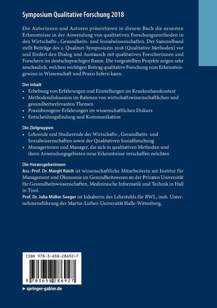 Die Autorinnen und Autoren präsentieren in diesem Buch die neuesten Erkenntnisse in der Anwendung von qualitativen Forschungsmethoden in den Wirtschafts-, Gesundheits- und Sozialwissenschaften. Der Sammelband stellt Beiträge des 2. Qualmet-Symposiums 2018 (Qualitative Methoden) vor und fördert den Dialog und Austausch mit qualitativen Forscherinnen und Forschern im deutschsprachigen Raum. Die vorgestellten Projekte zeigen sehr anschaulich, welchen wichtigen Beitrag qualitative Forschung zum Erkenntnisgewinn in Wissenschaft und Praxis liefern kann.