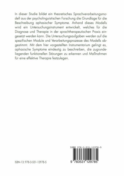 In dieser Studie bildet ein theoretisches Sprachverarbeitungsmodell aus der psycholinguistischen Forschung die Grundlage für die Beschreibung aphasischer Symptome. Anhand dieses Modells wird ein Untersuchungsinstrument entwickelt, welches für die Diagnose und Therapie in der sprachtherapeutischen Praxis eingesetzt werden kann. Die Untersuchungsaufgaben werden auf die spezifischen Module und Verarbeitungsprozesse des Modells abgestimmt. Mit dem hier vorgestellten Instrumentarium gelingt es, aphasische Symptome eindeutig zu beschreiben, die zugrundeliegenden funktionellen Störungen zu erkennen und Maßnahmen für eine effektive Therapie festzulegen.