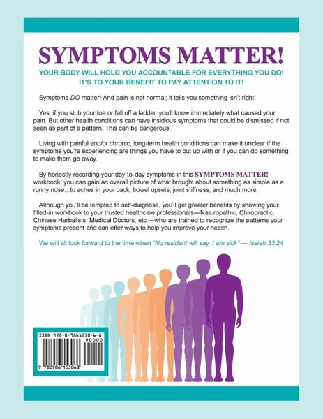SYMPTOMS MATTER! is a workbook to help you uncover and understand the association between your diet, your environment and pain. Living with painful and/or chronic, long-term health conditions can make it unclear if the symptoms you're experiencing are things you have to put up with or if you can do something to make them go away. Your body will hold you accountable for everything you do! It's to your benefit to pay attention to it! By honestly recording your day-to-day symptoms in this workbook, you gain an overall picture of what brought about something as simple as a runny nose...to aches in your back, bowel upsets, joint stiffness, and much more. Although you'll be tempted to self-diagnose, you'll get greater benefits by showing your filled-in workbook to your trusted healthcare professionals--Naturopathic, Chiropractic, Chinese Herbalists, Medical Doctors, etc.--who are trained to recognize the patterns your symptoms present, and can offer ways to help you improve your health.