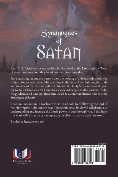 Rev 12:11, "And they overcame him by the blood of the Lamb and the Word of their testimony; and they loved not their lives unto death." False teachings about this verse led to the writing of a deep study about the subject. You can read these false teachings in the book. After finishing the study and in view of the current political climate, the Holy Spirit impressed upon me to do 2 Chronicles 7:14 and then a series of deeper studies ensued. Under the guidance and unction, these studies led to a common theme, thus the title synagogues of Satan. I had no inclination in my heart to write a book, but following the lead of the Holy Spirit, I did exactly that. I hope this small book will enlighten your understanding and increase the Lord's power in and through you. I also hope this book will also serve as a template as an effective way to study the word. Be blessed because you are.