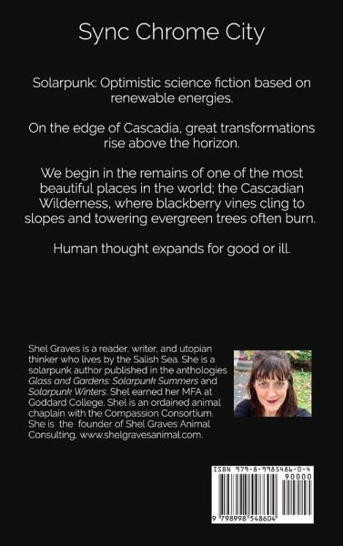 Shel Graves is a reader, writer, and utopian thinker who lives by the Salish Sea. She is a solarpunk author published in the anthologies Glass and Gardens: Solarpunk Summers and Glass and Gardens: Solarpunk Winters from World Weaver Press edited by Sarena Ulibarri. Shel earned her MFA at Goddard College, Port Townsend, a utopia which no longer exists. Shel is an ordained animal chaplain with the Compassion Consortium and as Shel Graves Animal Consulting, www.shelgravesanimal.com, aims to create a culture of compassion and pay attention to animals.
