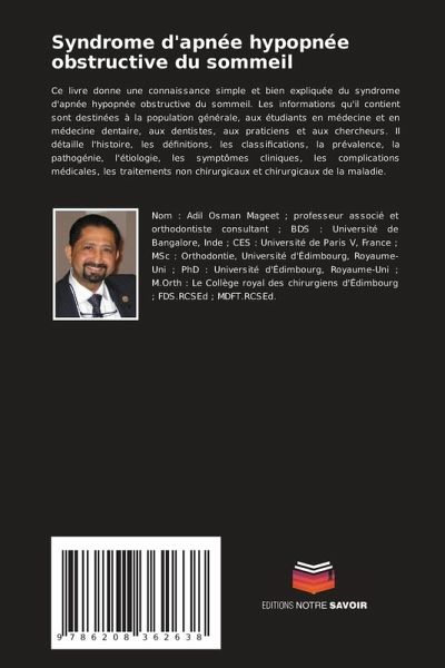 Ce livre donne une connaissance simple et bien expliquée du syndrome d'apnée hypopnée obstructive du sommeil. Les informations qu'il contient sont destinées à la population générale, aux étudiants en médecine et en médecine dentaire, aux dentistes, aux praticiens et aux chercheurs. Il détaille l'histoire, les définitions, les classifications, la prévalence, la pathogénie, l'étiologie, les symptômes cliniques, les complications médicales, les traitements non chirurgicaux et chirurgicaux de la maladie.