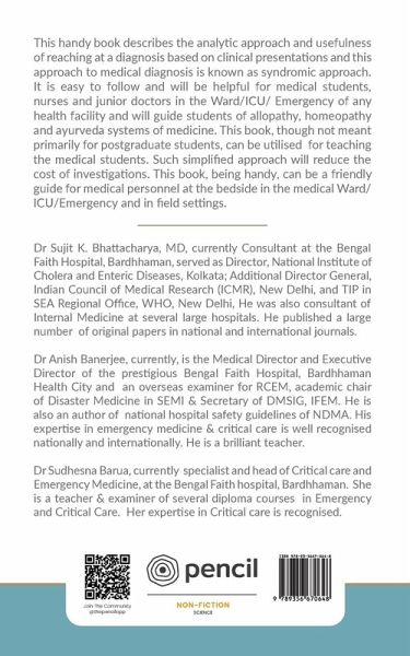 This handy book describes the analytic approach and usefulness of reaching at a diagnosis based on clinical presentations and this approach to medical diagnosis is known as syndromic approach. It is easy to follow and will be helpful for medical students, nurses and junior doctors in the Ward/ICU/ Emergency of any health facility and will guide students of allopathy, homeopathy and ayurveda systems of medicine. This book, though not meant primarily for postgraduate students, can be utilised for teaching the medical students. Such simplified approach will reduce the cost of investigations. This book, being handy, can be a friendly guide for medical personnel at the bedside in the medical Ward/ICU/Emergency and in field settings.
