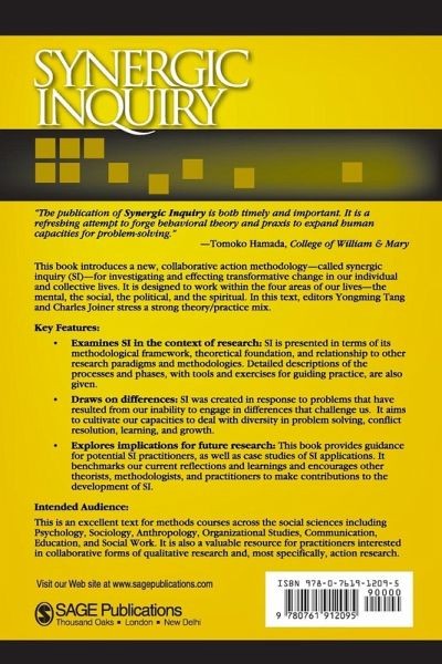 Foreword - Dean Elias Preface Introduction The SI Methodology and Its Theoretical Foundation Overview of Synergic Inquiry The Synergic Universe Si, Paradigms, and Other Methodologies Si Practices Practicing Synergic Inquiry Geisha and Cowboy: Synergizing Inner Lifer Differences Through the Mythic Realm - Joanne Gozawa Husband and Wife Synergizing - Venus Bobis Jendresen and Eric Bobis Synergizing the Mother-Daughter Relationship - Lien Cao Developing a Community Through Synergic Envisioning - Elisa Sabatini Using SI to Resolve a Group Conflict - Lien Cao Synergic Inquiry in Action: The Expansion of Racial Consciousness - Carole Barlas, Angela Cherry-Smith, Penny Rosenwasser, and Colette Winlock Gender Synergy: Using SI to Work with Gender Differences - Yongming Tang, David Goff, Anna Gatmon, Marianne Murray, Vickie Zhang, and George Kich Teaching SI in a High School Setting - Roma Hammel Synergizing Cultural Differences for Improving Organizational Performance: A Case Study of Synergic Inquiry in China - Charles Joiner, Yongming Tang, and Yifu Yin Synergic Inquiry and Organizational Transformation: A Case Study of SI Application to a US Organization Working in Mexico - Charles Joiner, Susan Cannon, and Karen O¿Neill Reflections and Implications