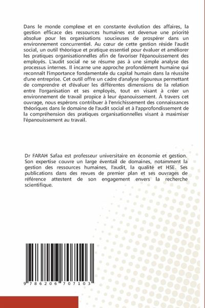 Dans le monde complexe et en constante évolution des affaires, la gestion efficace des ressources humaines est devenue une priorité absolue pour les organisations soucieuses de prospérer dans un environnement concurrentiel. Au coeur de cette gestion réside l'audit social, un outil théorique et pratique essentiel pour évaluer et améliorer les pratiques organisationnelles afin de favoriser l'épanouissement des employés. L'audit social ne se résume pas à une simple analyse des processus internes. Il incarne une approche profondément humaine qui reconnaît l'importance fondamentale du capital humain dans la réussite d'une entreprise. Cet outil offre un cadre d'analyse rigoureux permettant de comprendre et d'évaluer les différentes dimensions de la relation entre l'organisation et ses employés, tout en visant à créer un environnement de travail propice à leur épanouissement. À travers cet ouvrage, nous espérons contribuer à l'enrichissement des connaissances théoriques dans le domaine de l'audit social et à l'approfondissement de la compréhension des pratiques organisationnelles visant à maximiser l'épanouissement au travail.