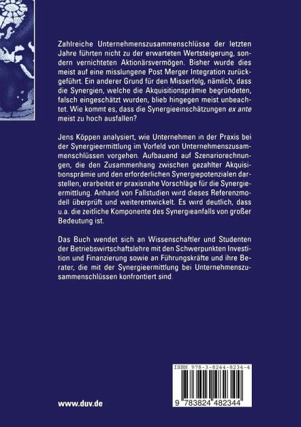 Aufbauend auf Szenariorechnungen, die den Zusammenhang zwischen gezahlter Akquisitionsprämie und den erforderlichen Synergiepotenzialen darstellen, erarbeitet Jens Köppen eine praxisnahe Vorgehensweise für die Synergieermittlung. Anhand von Fallstudien wird sein Referenzmodell überprüft und weiterentwickelt.