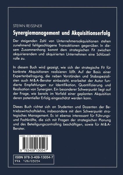 Die Ubernahme von ganzen Unternehmen oder Unternehmensteilen ist seit ge raumer Zeit eine der wichtigsten Wachstumsstrategien. 1m FaIle marktorientierter Akquisitionen ist die Integration bisher getrennter, selbstandiger Einheiten das Hauptproblem fiir das Erreichen des Akquisitionserfolgs. Gestiitzt auf theoretisch-konzeptionelle Uberlegungen sowie auf die Ergebnisse einer eigenen Befragung arbeitet der Verfasser prazise und klar die verschiedenen Probleme und Chancen der Integration heraus. Auf diese Weise werden insbeson dere die vielbeschworenen, aber selten prazisierten Synergieeffekte greifbar ge macht, und es werden verschiedene Akquisitionsstrategien ableitbar. Eingebettet in Konzepte des Strategischen Managements und durch zahlreiche Beispiele un terstiitzt, kann der Leser die Identifizierung, Analyse und Bewertung von Syner gieproblemen kennenlernen. Die plastisch formulierte Arbeit bietet dariiberhinaus eine Beschreibung der Aufgaben des Akquisitionsmanagements, und sie gibt zahl reiche methodische Hilfen fUr die Bestimmung von Kosten und Nutzen einer Ak quisition. Die Arbeit stellt nicht nur einen beachtlichen Beitrag zur Theorie des Strategi schen Managements dar, sondern sie kann vor allem den verantwortlichen Fiih rungskraften bei der Bewaltigung ihrer praktischen Probleme differenzierte Unter stiitzung leisten. Prof. Dr. W. Kriiger Vorwort Dem strategischen Fit zwischen Akquisiteur und Targetunternehmen kommt un umstritten eine Schliisselrolle im Hinblick auf den Erfolg marktorientierter Akqui sitionen zu. Angesichts einer unglaublich hohen MiBerfolgsquote bei Mergers & Acquisitions liegt der Verdacht nahe, daB es der Praxis bislang an geeigneten Denkwerkzeugen fehlt, bereits im Vorfeld geplanter Ubernahmen iiber potentielle Synergien und Dyssynergien befinden zu konnen. Dieses Defizit zu verringern oder gar vollig zu beseitigen, war der Ausgangspunkt der vorliegenden Schrift.