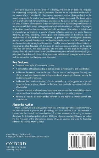 Synergy dicusses a general problem in biology: the lack of an adequate language for formulating biologically specific problems. It describes the recent progress in the control and coordination of human movement. The book begins with a brief history of movement studies and reviews the current central controversies in the area of control of movements with an emphasis on the equilibrium-point hypothesis. An operational definition of synergy is introduced and a method of analysis of synergies is described based on the uncontrolled manifold hypothesis. Further this method is used to characterize synergies in a variety of tasks including such common motor tasks as standing, pointing, reaching, standing-up, and manipulation of hand-held objects. Applications of this method to movements by persons with neurological disorders, persons with atypical development and healthy elderly persons are illustrated, as well as changes in motor synergies with practice. Possible neurophysiological mechanisms of synergies are also discussed with the focus on such conspicuous structures as the spinal cord, the cerebellum, the basal ganglia, and the cortex of the large hemispheres. A variety of models are discussed based on different computational and neurophysiological principles. Possible applications of the introduced definition of synergies to other areas such as perception and language are discussed.
