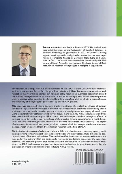 The creation of synergy, which is often illustrated as the ¿2+2=5-effect¿, is a dominant motive as well as a key success factor for Mergers & Acquisitions (M&A). Inadequate expectations with respect to the synergistic potential can however easily result in an overrated acquisition price. If the planned synergies later fail to materialize, it will be increasingly hard for the acquiring firm to achieve positive value gains for its shareholders. It is therefore vital to obtain a comprehensive understanding of the synergistic potential of a planned M&A project. This issue was addressed with a doctoral thesis investigating the underlying drivers of synergy realization, in particular the concept of business relatedness which describes the similarity of firm attributes, such as product-market presence, resource configuration and supply channel types. Using a quantitative hypothesis-testing survey design, more than 300 M&A consultants worldwide have been invited to evaluate past M&A transactions with respect to their synergistic effects. In contrast to earlier studies, the relatedness of the merging firms is established as a multi-dimensional concept considering various attributes of business relatedness simultaneously. The degree of relatedness is measured using managerial perceptions which is a comparatively new measurement approach transferred from diversification research to the field of M&A. The individual dimensions of relatedness show a different effectiveness concerning synergy realization providing further support to recent contributions which advocate a multi-dimensional conceptualization of business relatedness. The study identifies dimensions of business relatedness and their underlying drivers which are particularly relevant to predictions concerning the synergistic potential. The research project thus makes a valuable contribution to clarify the impact of relatedness on M&A performance and provides important implications for practitioners regarding the evaluation of synergies and dyssynergies in future M&A projects.