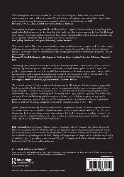 "Some people are lumpers, trying to build a world of high-level categories. Others are splitters, seeing fine-grained detail and multiple types wherever they look. Few of us can be both, but as with everything he does, Erik Hollnagel shows he can. Synesis integrates huge amounts of detail about organisational life without losing the particulars. It's an idea destined to become widely used, like so many of his contributions." - Prof. Jeffrey Braithwaite, Macquarie University, Sydney, Australia