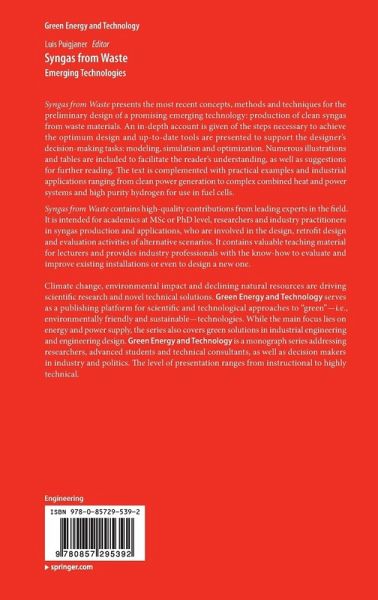 Syngas from Waste presents the most recent concepts, methods and techniques for the preliminary design of a promising emerging technology: production of clean syngas from waste materials. An in-depth account is given of the steps necessary to achieve the optimum design and up-to-date tools are presented to support the designer's decision-making tasks: modelling, simulation and optimization. Numerous illustrations and tables are included to facilitate the reader's understanding, as well as suggestions for further reading. The text is complemented with practical examples and industrial applications ranging from clean power generation to complex combined heat and power systems and high purity hydrogen for use in fuel cells.
