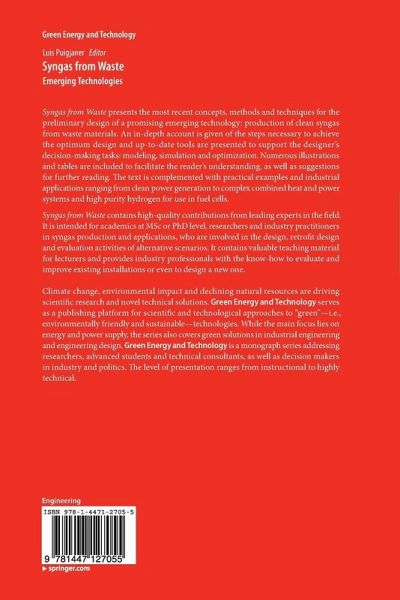 Syngas from Waste presents the most recent concepts, methods and techniques for the preliminary design of a promising emerging technology: production of clean syngas from waste materials. An in-depth account is given of the steps necessary to achieve the optimum design and up-to-date tools are presented to support the designer's decision-making tasks: modelling, simulation and optimization. Numerous illustrations and tables are included to facilitate the reader's understanding, as well as suggestions for further reading. The text is complemented with practical examples and industrial applications ranging from clean power generation to complex combined heat and power systems and high purity hydrogen for use in fuel cells.