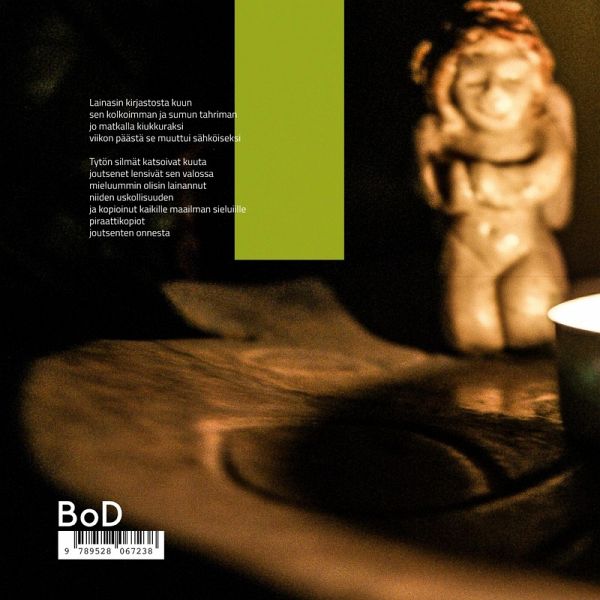 Lainasin kirjastosta kuun sen kolkoimman ja sumun tahriman jo matkalla kiukkuraksi viikon päästä se muuttui sähköiseksi Tytön silmät katsoivat kuuta joutsenet lensivät sen valossa mieluummin olisin lainannut niiden uskollisuuden ja kopioinut kaikille maailman sieluiille piraattikopiot joutsenten onnesta Koska ihminen osaa vain pyllistää ainoa yhteys viattomaan olentoon ajatukset aivojen untuvapeitossa se kahdeksan prosenttia kapasiteetista unien ja unelmien täyttäessä 92 prosenttia muusta tilasta lennä pienillä siivillä ¿ Antoisia lukuhetkiä niin surrealismin ystäville, kuin muillekin runon ystäville. Kirja kertoo kasvutarinan kun elämässä on muutakin kuin yksinolo. Kirjan muutamat yksinäisyys runot ovat vain muisto menneestä. Kiitän ihmisiä, jotka kuuluvat elämääni, jaksamisestanne. Kiitos, etten ole enää niin yksin. Halaan psykedeliaa ja vesiväripiirtoheittimiä. Hippi minussa ei ole kuollut selvänäkään. Peace and love kaikille Ukrainan sodan melskeissä.