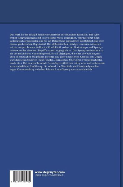 The work is the only dictionary of synonyms for German idiomatic expressions. The idioms are accessible in a twofold way, either via a systematic section of semantic fields or an alphabetical record. The alphabetical entries, in turn, refer to the semantic fields so that the full contexts of meaning and synonymy are immediately available. The dictionary is an essential reference work for everyone who requires a versatile idiomatic style and an in-depth knowledge of contemporary German (writers, journalists, translators, foreign learners etc.). The new edition now includes a comprehensive, all new scholarly introduction exploring the close connection between idiomology and synonymy.