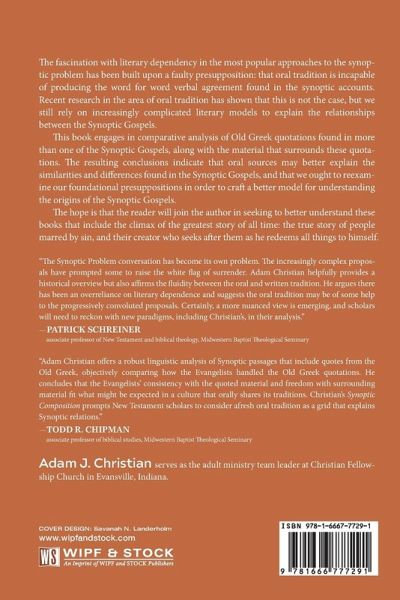 The fascination with literary dependency in the most popular approaches to the synoptic problem has been built upon a faulty presupposition: that oral tradition is incapable of producing the word for word verbal agreement found in the synoptic accounts. Recent research in the area of oral tradition has shown that this is not the case, but we still rely on increasingly complicated literary models to explain the relationships between the Synoptic Gospels. This book engages in comparative analysis of Old Greek quotations found in more than one of the Synoptic Gospels, along with the material that surrounds these quotations. The resulting conclusions indicate that oral sources may better explain the similarities and differences found in the Synoptic Gospels, and that we ought to reexamine our foundational presuppositions in order to craft a better model for understanding the origins of the Synoptic Gospels. The hope is that the reader will join the author in seeking to better understand these books that include the climax of the greatest story of all time: the true story of people marred by sin, and their creator who seeks after them as he redeems all things to himself.