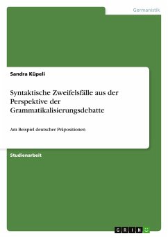 Studienarbeit aus dem Jahr 2005 im Fachbereich Germanistik - Semiotik, Pragmatik, Semantik, Note: 1,3, Ruhr-Universität Bochum (Germanistisches Institut), Veranstaltung: Hauptseminar: Syntaktische Zweifelsfälle, Sprache: Deutsch, Abstract: Das Konzept der Grammatikalisierung eignet sich neben sprachvergleichenden Untersuchungen und der Beschreibung historischer Entwicklungen auch zur Einordnung synchroner Erscheinungen. Somit sollen im synchronen Sprachgebrauch vorkommende Zweifelsfälle anhand dieser Theorie beleuchtet werden. Nachdem in einem ersten Schritt geklärt wird, was hier mit "Zweifelsfall" gemeint ist, sollen die Grundzüge des Grammatikalisierungskonzeptes in Kapitel 3 vorgestellt werden, um dann näher auf die Grammatikalisierung deutscher Präpositionen einzugehen. Ausschlaggebend ist dabei nicht zuletzt das im Jahr 2000 erschienene Werk von Claudio Di Meola, der dieses Phänomen erstmalig ganzheitlich betrachtet. Es wird versucht, grammatikalisch zweifelhafte oder mehrdeutige Fälle im präpositionalen Gebrauch zu erklären. Dies kann zwar nicht ganz ohne den Rückgriff auf die diachrone Entwicklung geschehen, doch wird der Schwerpunkt der hier vorliegenden Arbeit deutlich durch die synchrone Betrachtung der präpositionalen Zweifelsfälle bestimmt. Beispielhaft für Varianten im Sprachgebrauch werden besonders der Wechsel zwischen Prä- und Poststellung sowie die Alternation zwischen Dativ- und Genitivrektion betrachtet. Schließlich soll die Darstellung syntaktischer Zweifelsfälle in einem der wichtigsten deutschsprachigen Nachschlage, dem Duden, untersucht werden hinsichtlich der vorangestellten Beobachtungen zur Grammatikalisierung deutscher Präpositionen. Unterschiedliche Herangehensweisen an das Phänomen Zweifelsfall sollen kontrastiert, aber auch Gemeinsamkeiten bei der Betrachtung dieser Fälle herausgestellt werden.