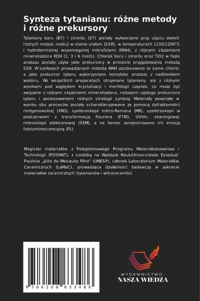 Tytaniany baru (BT) i strontu (ST) zostäy wytworzone przy u¿yciu dwóch ró¿nych metod, reakcji w stanie stäym (SSR), w temperaturach 1150/1200°C i hydrotermalnej wspomaganej mikrofalami (MAH), z ró¿nymi st¿¿eniami mineralizatora KOH (1, 3 i 6 mol/L). Chlorek baru i strontu oraz TiO2 w fazie anatazu zostäy u¿yte jako prekursory w procesie przygotowania metod¿ SSR. W syntezach prowadzonych metod¿ MAH zastosowano te same chlorki, a jako prekursor tytanu wykorzystano kompleks anatazu z nadtlenkiem wodoru. We wszystkich preparatach otrzymano tytaniany, ale z ró¿nymi wynikami pod wzgl¿dem krystalizacji i morfologii cz¿stek, co mo¿e by¿ zwi¿zane z ró¿nymi st¿¿eniami mineralizatora, rodzajem u¿ytego prekursora tytanu i zastosowaniem ró¿nych strategii syntezy. Materiäy powstäe w wyniku obu procesów zostäy scharakteryzowane za pomoc¿ dyfraktometrii rentgenowskiej (XRD), spektroskopii mikro-Ramana (MR), spektroskopii w podczerwieni z transformacj¿ Fouriera (FTIR), UV-Vis, skaningowej mikroskopii elektronowej (SEM), a na koniec zarejestrowano ich emisj¿ fotoluminescencyjn¿ (FL).