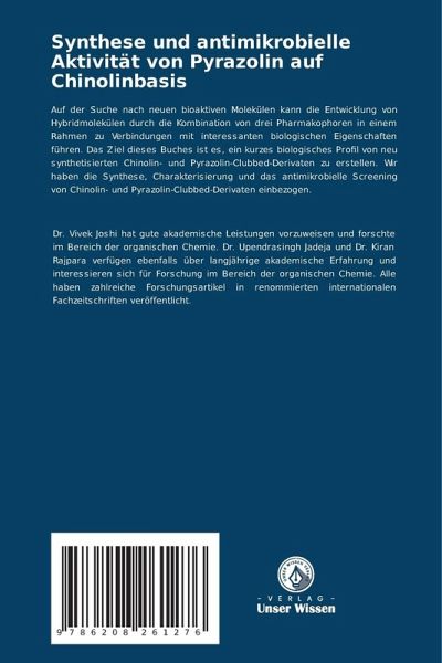 Auf der Suche nach neuen bioaktiven Molekülen kann die Entwicklung von Hybridmolekülen durch die Kombination von drei Pharmakophoren in einem Rahmen zu Verbindungen mit interessanten biologischen Eigenschaften führen. Das Ziel dieses Buches ist es, ein kurzes biologisches Profil von neu synthetisierten Chinolin- und Pyrazolin-Clubbed-Derivaten zu erstellen. Wir haben die Synthese, Charakterisierung und das antimikrobielle Screening von Chinolin- und Pyrazolin-Clubbed-Derivaten einbezogen.