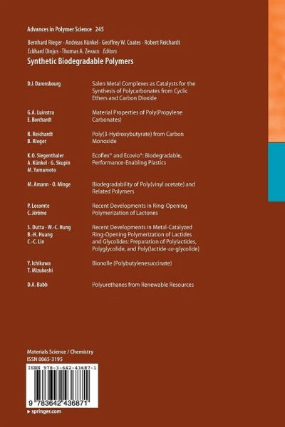 Salen Metal Complexes as Catalysts for the Synthesis of Polycarbonates from Cyclic Ethers and Carbon Dioxide, by Donald J. Darensbourg.- Material Properties of Poly(Propylene Carbonates), by Gerrit. A. Luinstra and Endres Borchardt.- Poly(3-Hydroxybutyrate) from Carbon Monoxide, by Robert Reichardt and Bernhard Rieger. - Ecoflex® and Ecovio®: Biodegradable, Performance-Enabling Plastics, by K. O. Siegenthaler, A. Künkel, G. Skupin and M. Yamamoto.- Biodegradability of Poly(Vinyl Acetate) and Related Polymers, by Manfred Amann and Oliver Minge.- Recent Developments in Ring-Opening Polymerization of Lactones, by P. Lecomte and C. Jérôme.-Recent Developments in Metal-Catalyzed Ring-Opening Polymerization of Lactides and Glycolides: Preparation of Polylactides, Polyglycolide, and Poly(lactide-co-glycolide), by Saikat Dutta, Wen-Chou Hung, Bor-Hunn Huang and Chu-Chieh Lin.-Bionolle (Polybutylenesuccinate), by Yasushi Ichikawa, Tatsuya Mizukoshi.- Polyurethanes from Renewable Resources, by David A. Babb.-