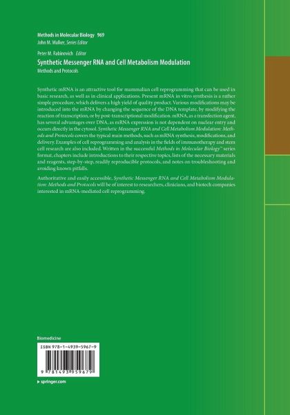 Synthetic mRNA is an attractive tool for mammalian cell reprogramming that can be used in basic research, as well as in clinical applications. Present mRNA in vitro synthesis is a rather simple procedure, which delivers a high yield of quality product. Various modifications may be introduced into the mRNA by changing the sequence of the DNA template, by modifying the reaction of transcription, or by post-transcriptional modification. mRNA, as a transfection agent, has several advantages over DNA, as mRNA expression is not dependent on nuclear entry and occurs directly in the cytosol. Synthetic Messenger RNA and Cell Metabolism Modulation: Methods and Protocols covers the typical main methods, such as mRNA synthesis, modifications, and delivery. Examples of cell reprogramming and analysis in the fields of immunotherapy and stem cell research are also included. Written in the successful Methods in Molecular Biology(TM) series format, chapters include introductions to their respective topics, lists of the necessary materials and reagents, step-by-step, readily reproducible protocols, and notes on troubleshooting and avoiding known pitfalls.
