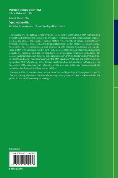 SyntheticmRNA: Production, Introduction into Cells, and Physiological Consequences is a valuable and cutting-edge resourcefor both laboratory investigators and clinicians interested in this powerfuland rapidly evolving technology.