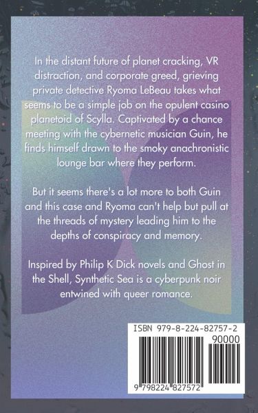 In the distant future of planet cracking, VR distraction, and corporate greed, grieving private detective Ryoma LeBeau takes what seems to be a simple job on the opulent casino planetoid of Scylla. Captivated by a chance meeting with the cybernetic musician Guin, he finds himself drawn to the smoky anachronistic lounge bar where they perform. But it seems there's a lot more to both Guin and this case and Ryoma can't help but pull at the threads of mystery leading him to the depths of conspiracy and memory. Inspired by Philip K Dick novels and Ghost in the Shell, Synthetic Sea is a cyberpunk noir entwined with queer romance.