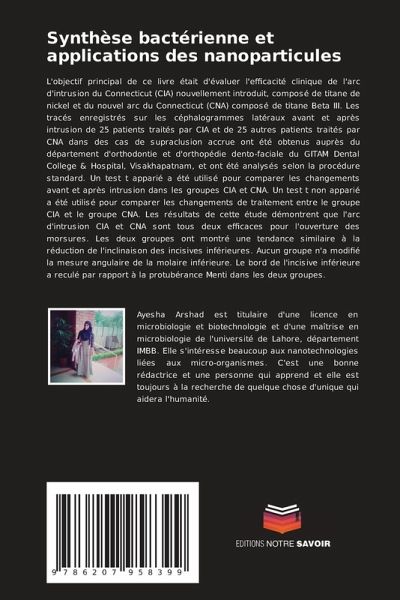 L'objectif principal de ce livre était d'évaluer l'efficacité clinique de l'arc d'intrusion du Connecticut (CIA) nouvellement introduit, composé de titane de nickel et du nouvel arc du Connecticut (CNA) composé de titane Beta III. Les tracés enregistrés sur les céphalogrammes latéraux avant et après intrusion de 25 patients traités par CIA et de 25 autres patients traités par CNA dans des cas de supraclusion accrue ont été obtenus auprès du département d'orthodontie et d'orthopédie dento-faciale du GITAM Dental College & Hospital, Visakhapatnam, et ont été analysés selon la procédure standard. Un test t apparié a été utilisé pour comparer les changements avant et après intrusion dans les groupes CIA et CNA. Un test t non apparié a été utilisé pour comparer les changements de traitement entre le groupe CIA et le groupe CNA. Les résultats de cette étude démontrent que l'arc d'intrusion CIA et CNA sont tous deux efficaces pour l'ouverture des morsures. Les deux groupes ont montré une tendance similaire à la réduction de l'inclinaison des incisives inférieures. Aucun groupe n'a modifié la mesure angulaire de la molaire inférieure. Le bord de l'incisive inférieure a reculé par rapport à la protubérance Menti dans les deux groupes.