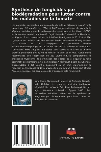 Les présentes recherches sur la maladie du mildiou (Alternaria solani) de la tomate ont été menées en 2014 et 2015 au département de pathologie végétale, au laboratoire de pathologie des semences et des tissus (SEPA), au laboratoire central, à la faculté d'agriculture de l'université de Mansoura, en Égypte. Trois concentrations de lubrifiant biodégradable 55, 110 et 220 µg/mlpour les déchets pétroliers ont résulté de deux isolats biodégradables (le premier est le champignon de pourriture blanche Phanerochaetechrysosporium et le second est la bactérie Pseudomonas fluorescens NRRL 340) ont été testés pour contre la maladie du mildiou précoce (Alternaria solani) de la tomate in vitro et in vivo. Cette étude recommande que l'application de 220 µg/ml réduise complètement la croissance mycélienne, la germination des spores et la longueur du tube germinatif du champignon A. solani (isolats Al-Tawfiqiyah-Badr). Le lubrifiant biodégradable à 220 µg/ml a également eu un effet important sur la réduction de l'incidence et de la gravité de la maladie et a fortement affecté l'analyse chimique, les paramètres de croissance et le rendement.