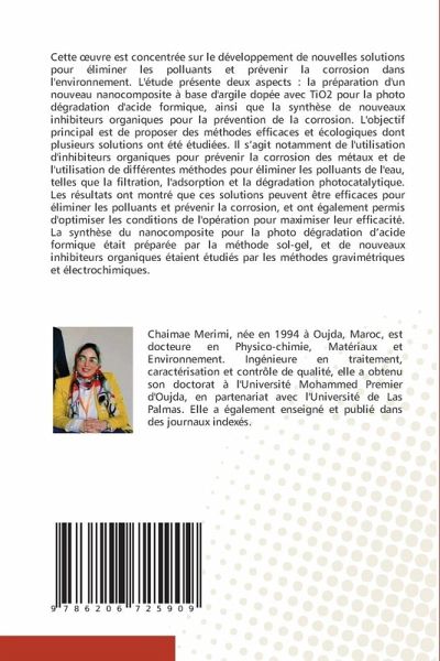 Cette oeuvre est concentrée sur le développement de nouvelles solutions pour éliminer les polluants et prévenir la corrosion dans l'environnement. L'étude présente deux aspects : la préparation d'un nouveau nanocomposite à base d'argile dopée avec TiO2 pour la photo dégradation d'acide formique, ainsi que la synthèse de nouveaux inhibiteurs organiques pour la prévention de la corrosion. L'objectif principal est de proposer des méthodes efficaces et écologiques dont plusieurs solutions ont été étudiées. Il s'agit notamment de l'utilisation d'inhibiteurs organiques pour prévenir la corrosion des métaux et de l'utilisation de différentes méthodes pour éliminer les polluants de l'eau, telles que la filtration, l'adsorption et la dégradation photocatalytique. Les résultats ont montré que ces solutions peuvent être efficaces pour éliminer les polluants et prévenir la corrosion, et ont également permis d'optimiser les conditions de l'opération pour maximiser leur efficacité. La synthèse du nanocomposite pour la photo dégradation d'acide formique était préparée par la méthode sol-gel, et de nouveaux inhibiteurs organiques étaient étudiés par les méthodes gravimétriques et électrochimiques.
