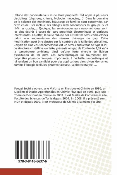 L'étude des nanomatériaux et de leurs propriétés fait appel à plusieurs disciplines (physique, chimie, biologie, médecine,...). Dans le domaine de la science des matériaux, beaucoup de familles sont concernées par cette étude : les métaux, les alliages semi-conducteurs du groupe IV et III-V, les oxydes,... Quoique, les semi-conducteurs nanométriques sont les plus désirés à cause de leurs propriétés électroniques et optiques intéressantes. En effet, la taille réduite des cristallites semi-conductrices induit une augmentation des niveaux d'énergie du gap. Cette modification peut être ajustée par le contrôle de la taille des cristallites. L'oxyde de zinc ZnO nanométrique est un semi-conducteur de type II-VI, de structure cristalline wurtzite, présente un gap de l'ordre de 3,37 eV à la température ambiante ainsi qu'une forte énergie de liaison d'excitation de 60 meV. Ces caractéristiques lui fournissent des propriétés physico-chimiques importantes à l'échelle nanométrique et lui rendent un bon candidat pour des applications dans divers domaines comme l'énergie (cellules photovoltaïques), la photocatalyse, ...