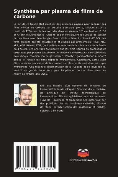 Le but de ce travail était d'utiliser des procédés plasma pour déposer des films minces de carbone sur certains substrats (verre, silicium et verre revêtu de FTO) puis de les corroder dans un plasma SF6 combiné à H2, O2 et Ar afin d'augmenter la rugosité et par conséquent la surface de contact de ces films avec l'électrolyte d'une cellule solaire à colorant (DSSC). Les films produits ont été caractérisés et étudiés par profilométrie, MEB, XRD, XPS, AFM, RAMAN, FTIR, goniométrie et mesure de la résistance de la feuille en 4 points. Ces analyses ont montré que les films soumis au processus de texturation par plasma ont obtenu un schéma nanostructural caractéristique pour chaque combinaison de gaz utilisée. L'analyse goniométrique a montré que le TT rendait les films déposés hydrophobes. Cependant, après avoir été soumis au processus de texturation par plasma, ils sont devenus super hydrophiles. Ces résultats (augmentation de la rugosité et de l'hydrophilie) sont d'une grande importance pour l'application de ces films dans les contre-électrodes des DSSC.