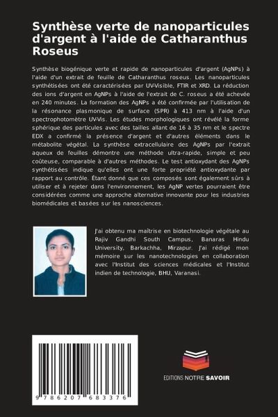 Synthèse biogénique verte et rapide de nanoparticules d'argent (AgNPs) à l'aide d'un extrait de feuille de Catharanthus roseus. Les nanoparticules synthétisées ont été caractérisées par UV-Visible, FTIR et XRD. La réduction des ions d'argent en AgNPs à l'aide de l'extrait de C. roseus a été achevée en 240 minutes. La formation des AgNPs a été confirmée par l'utilisation de la résonance plasmonique de surface (SPR) à 413 nm à l'aide d'un spectrophotomètre UV-Vis. Les études morphologiques ont révélé la forme sphérique des particules avec des tailles allant de 16 à 35 nm et le spectre EDX a confirmé la présence d'argent et d'autres éléments dans le métabolite végétal. La synthèse extracellulaire des AgNPs par l'extrait aqueux de feuilles démontre une méthode ultra-rapide, simple et peu coûteuse, comparable à d'autres méthodes. Le test antioxydant des AgNPs synthétisées indique qu'elles ont une forte propriété antioxydante par rapport au contrôle. Étant donné que ces composés sont également sûrs à utiliser et à rejeter dans l'environnement, les AgNP vertes pourraient être considérées comme une approche alternative innovante pour les industries biomédicales et basées sur les nanosciences.