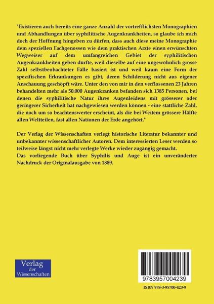 Das vorliegende Buch über Syphilis und Auge ist ein unveränderter Nachdruck der Originalausgabe von 1889.