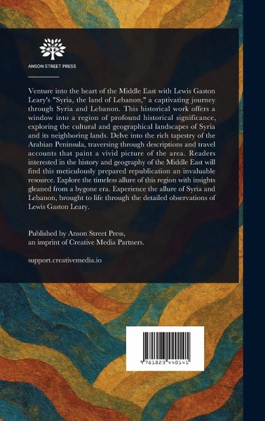 Venture into the heart of the Middle East with Lewis Gaston Leary's "Syria, the land of Lebanon," a captivating journey through Syria and Lebanon. This historical work offers a window into a region of profound historical significance, exploring the cultural and geographical landscapes of Syria and its neighboring lands. Delve into the rich tapestry of the Arabian Peninsula, traversing through descriptions and travel accounts that paint a vivid picture of the area. Readers interested in the history and geography of the Middle East will find this meticulously prepared republication an invaluable resource. Explore the timeless allure of this region with insights gleaned from a bygone era. Experience the allure of Syria and Lebanon, brought to life through the detailed observations of Lewis Gaston Leary. This work has been selected by scholars as being culturally important, and is part of the knowledge base of civilization as we know it. This work is in the public domain in the United States of America, and possibly other nations. Within the United States, you may freely copy and distribute this work, as no entity (individual or corporate) has a copyright on the body of the work. Scholars believe, and we concur, that this work is important enough to be preserved, reproduced, and made generally available to the public. We appreciate your support of the preservation process, and thank you for being an important part of keeping this knowledge alive and relevant.