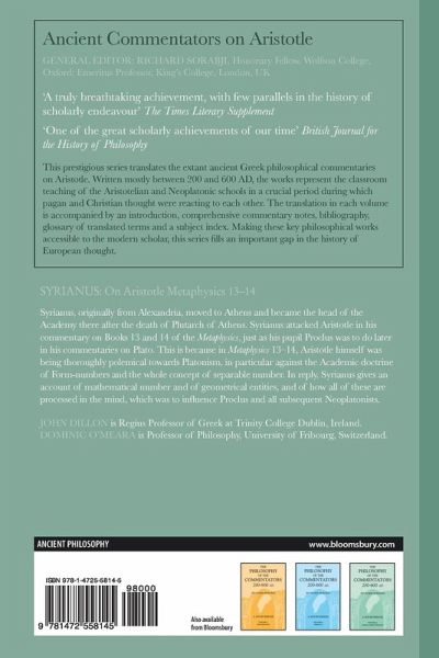 Until the launch of this series in 1985, the 15,000 volumes of the ancient Greek commentators on Aristotle, written mainly between 200 and 600 AD, constituted the largest corpus of extant Greek philosophical writings not translated into English or other European languages. Syrianus, originally from Alexandria, moved to Athens and became the head of the Academy there after the death of Plutarch of Athens. Syrianus attacked Aristotle in his commentary on Books 13 and 14 of the Metaphysics, just as his pupil Proclus was to do later in his commentaries on Plato. This is because in Metaphysics 13-14, Aristotle himself was being thoroughly polemical towards Platonism, in particular against the Academic doctrine of Form-numbers and the whole concept of separable number. In reply, Syrianus gives an account of mathematical number and of geometrical entities, and of how all of these are processed in the mind, which was to influence Proclus and all subsequent Neoplatonists.
