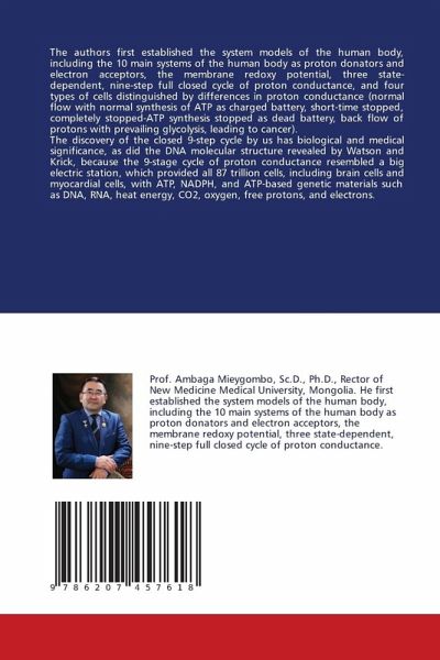 The authors first established the system models of the human body, including the 10 main systems of the human body as proton donators and electron acceptors, the membrane redoxy potential, three state-dependent, nine-step full closed cycle of proton conductance, and four types of cells distinguished by differences in proton conductance (normal flow with normal synthesis of ATP as charged battery, short-time stopped, completely stopped-ATP synthesis stopped as dead battery, back flow of protons with prevailing glycolysis, leading to cancer).The discovery of the closed 9-step cycle by us has biological and medical significance, as did the DNA molecular structure revealed by Watson and Krick, because the 9-stage cycle of proton conductance resembled a big electric station, which provided all 87 trillion cells, including brain cells and myocardial cells, with ATP, NADPH, and ATP-based genetic materials such as DNA, RNA, heat energy, CO2, oxygen, free protons, and electrons.