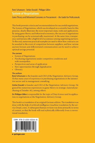 This book presents criteria and recommendations for successful negotiations. The System of Negotiations, which was developed on a scientific basis for this purpose, clearly illustrates the most important steps, tools and applications. By using game theory and behavioral economics, the success of negotiations in purchasing can be systematically maximized. At the same time, transparency and fairness offer a high level of acceptance among negotiating partners. To this end, numerous practical examples are used to show how contracts can be awarded in the event of competition between suppliers, and how various auction formats and differentiated communication can be used to achieve optimal savings potential. Also for situations where the supplier is a monopolist, ways are described to avoid being at the mercy of pricing power.