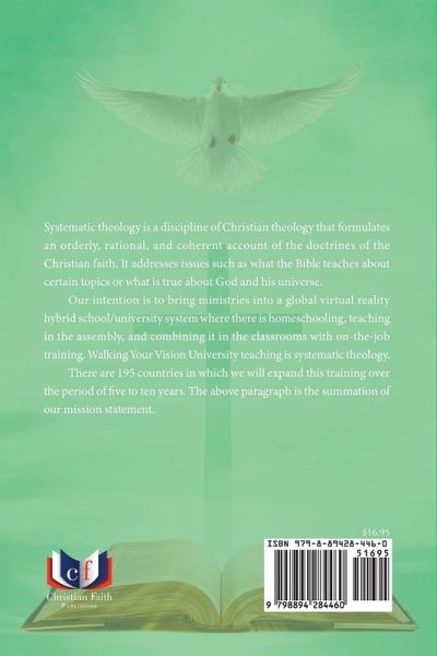 Systematic theology is a discipline of Christian theology that formulates an orderly, rational, and coherent account of the doctrines of the Christian faith. It addresses issues such as what the Bible teaches about certain topics or what is true about God and his universe. Our intention is to bring ministries into a global virtual reality hybrid school/university system, where there is homeschooling, teaching in the assembly, and combining it in the classrooms with on-the-job training. Walking Your Vision University teaching is systematic theology. There are 195 countries in which we will expand this training over the period of five to ten years. The above paragraph is the summation of our mission statement. Www.cfacs.com Info@cfacs.com